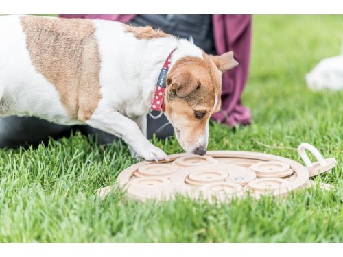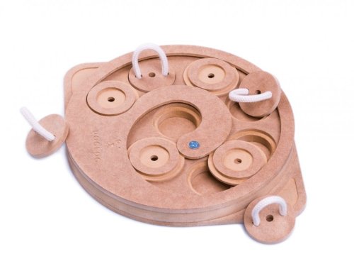 Tato hra sice vyžaduje notnou dávku soustředění a psí trpělivosti, ale až v té nejvyšší obtížnosti. Do ní Váš chlupáč dospěje zábavným tréninkem. Stačí k tomu jen mňaminky a šroubovák. :) Všechny posuvné kameny lze po odšroubování středu vyndat. Vy sami si rozhodnete, jak vysokou obtížnost hlavolamu nastavíte. Variabilita je opravdu široká. Od easy až po hard. Až zvládne i ten nejtěžší level, můžete mu hlavolam připravovat dle vlastní potřeby.
