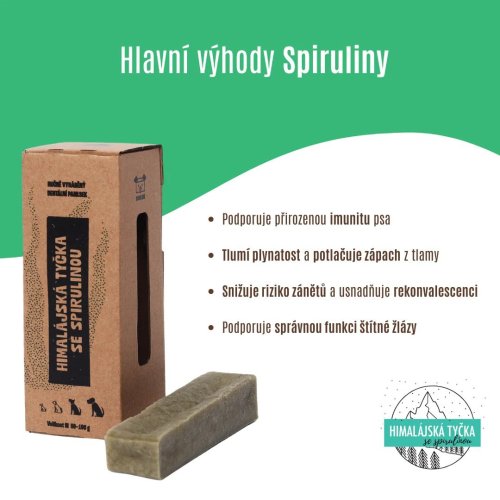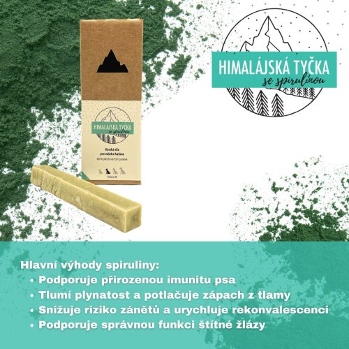 Oblíbená Himalájská tyčka od Dogsie dostala zelený kabátek! Tentokrát jsme ji obohatili o spirulinu – přírodní superpotravinu, která podporuje imunitu, zdravé trávení i svěží dech. Stejně jako klasická varianta je i tato tyčka extra tvrdá a dlouhotrvající. Díky výrobě z kvalitního belgického mléka od kraviček z pastvin a pomalému sušení po dobu až 3 měsíců se při žvýkání a slinění postupně obrušuje a měkne, takže si ji pejsek bezpečně užije a přitom si čistí zuby.