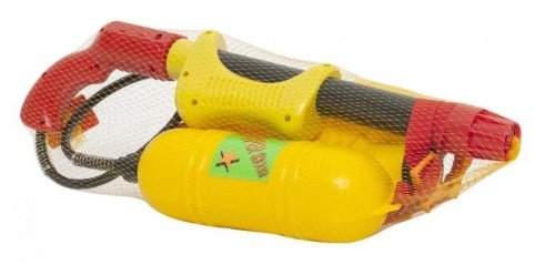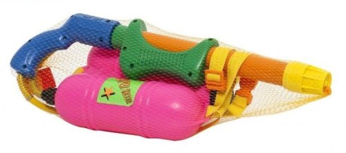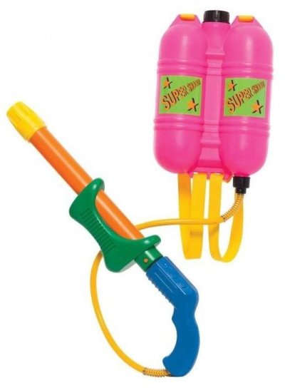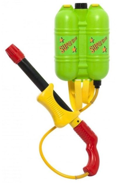 Plastová vodní pistole s dvojitým zásobníkem na vodu. Zásobník je s pistolí spojený hadičkou. Stačí pumpovat vodní bitva může začít. Zásobník na vodu mí objem cca 2,5 litru a díky popruhům s přezkami lze umístit na záda.