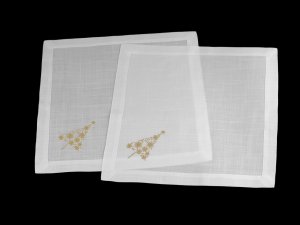 Stylové vánoční prostírání zdobí zlatá lurexová výšivka stromečku.