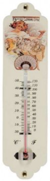 Teploměr s motivem Alfonse Muchy balený v papírové krabičce.