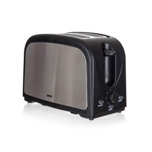 Elektrický topinkovač na dva tousty s příkonem 800 W má 7 stupňů nastavení intenzity opečení, automatické vypínání, tlačítko na rozpékání mraženého pečiva a tlačítko pro opakovaný ohřev.