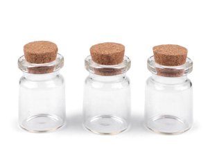 Skleněná lahvička s korkovým uzávěrem se dá využít ke skladování drobných předmětů jako jsou perličky, glitry, flitry apod.