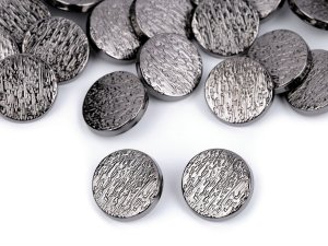 Drobný knoflík na potahování se skládá z kovové a plastové části.