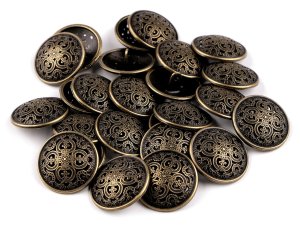 Kovové knoflíky s filigránovým vzorem jsou vyrobené ze slitiny zinku a nemagnetických kovů.