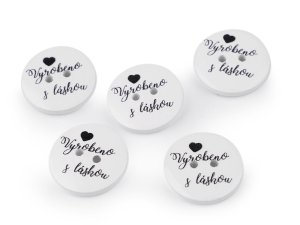 Dřevěné dekorační knoflíky zdobí květinový potisk a nápis "Vyrobeno s láskou".