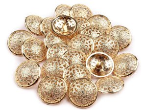 Kovové knoflíky s filigránovým vzorem jsou vyrobené ze slitiny zinku a nemagnetických kovů.