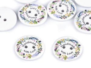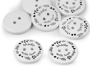Dřevěné dekorační knoflíky zdobí nápis "Made with love" [a "Handmade with love".] Vyniknou na ručních výrobcích, dárcích a různých dekoracích.