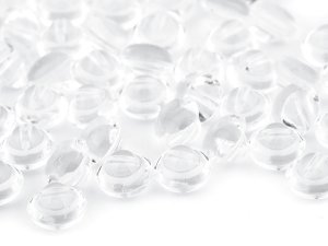 Transparentní plastové knoflíky mají spodní přišívání a hladkou polokulatou hlavičku.