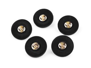 Elegantní knoflíky jsou potažené sametem a v jejich středu je kovová ozdoba.