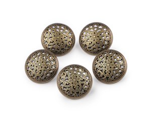 Kovové knoflíky s filigránovým vzorem jsou vyrobené ze slitiny zinku a nemagnetických kovů.