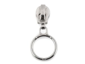 Kovový jezdec s táhlem v podobě kroužku je určený ke spirálovým zipům v metráži, které u nás najdete pod kódem 790304, 800963, [750994, 750503, 790305].