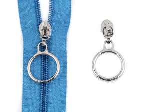 Kovový jezdec s táhlem v podobě kroužku je určený ke spirálovým zipům o šíři 3 mm v metráži, které u nás najdete pod kódem 750678, 050716, 060714.
