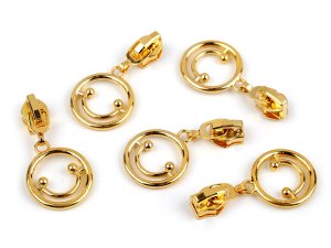 Kovový ozdobný jezdec má tvar smajlíka.