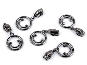 Kovový jezdec s táhlem v podobě kroužku je určený ke spirálovým zipům v metráži, které u nás najdete pod kódem 790304, 800963, [750994, 750503, 790305].
