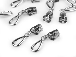 Kovový jezdec s táhlem v podobě kroužku je určený ke spirálovým zipům v metráži, které u nás najdete pod kódem 790304, 800963, [750994, 750503, 790305].