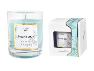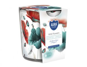 Vonná svíčka ve skle, s potištěnou fólií znázorňující použitou vůni.