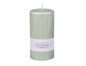 Svíčka ve tvaru válce s reliéfním zdobením v podobě svislých proužků.