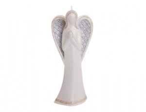 Matná svíčka v podobě anděla. Má zdobená křídla, hlavu a spodní lem glitrovým proužkem.