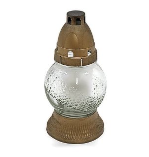 Skleněná hřbitovní svíčka s vyměnitelnou parafínovou náplní 30g, s plastovým spodkem, zajišťujícím dobrou stabilitu skla a plastovým vrškem, který chrání plamen před zhasnutím vlivem větru a deště.