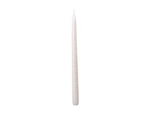 Kónická stolní svíčka je po obvodu zdobená jemnými proužky se třpytkami.