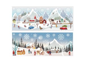 Okenní fólie o rozměru 210×600 mm s motivy trpaslíků a sněhuláků.