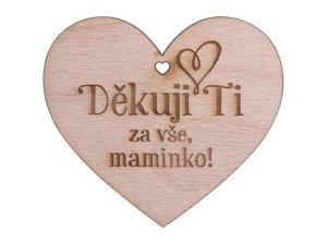 Malé dřevěné srdíčko s dírkou ve tvaru srdce a gravírovaným milým vzkazem.