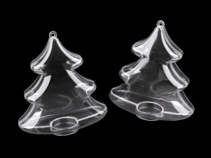 Průhledné plastové objekty se skládají ze dvou dílů, které lze spojit a pomocí očka zavěsit jako dekoraci.