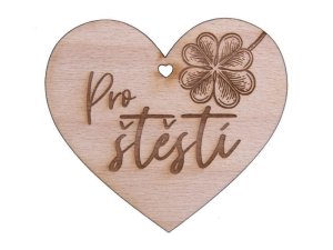 Malé dřevěné srdíčko s dírkou ve tvaru srdce a gravírovaným milým vzkazem.