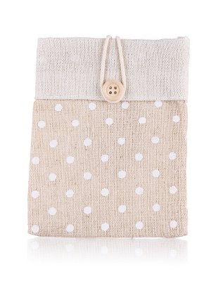 Přírodní dekorativní pytlík z bavlny světle hnědý s dekorem bílý puntík a zapínáním na knoflík, rozměr: 10,5 x 14 cm.