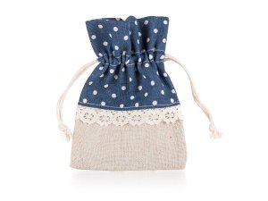 Přírodní dekorativní pytlík z bavlny, kombinace přírodní a modré bravy s dekorem bílé puntíky, rozměr: 10 x 13 cm.