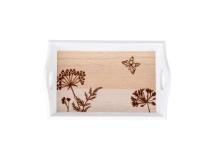 Bílý dřevěný tác – praktický a dekorativní pro servírování nebo aranžmá.