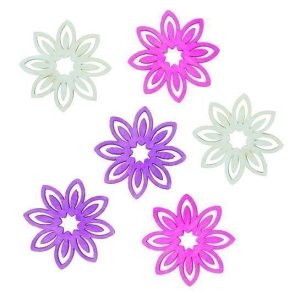 Dřevěné kytičky v růžové, fialové a bílé barvě jsou určeny k vytváření dekorací.