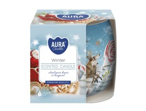 Vonná modrá vánoční svíčka ve skle, zabalená v krabičce s vánočním motivem zasněžené chaloupky a stromů.