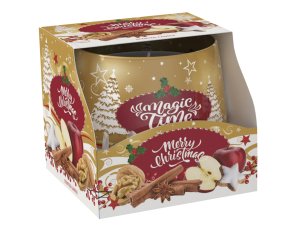 Vonná svíčka ve skle s vánoční vůní Magic Time spojuje ovocné, kořenité a sladké tóny, které vytvářejí slavnostní a hřejivou atmosféru.