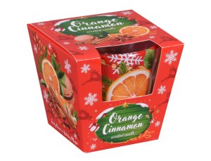 Vonná svíčka ve skle s vůní pomeranče a skořice spojuje svěží citrusové a hřejivé kořenité tóny, které vytvářejí příjemnou vánoční atmosféru.