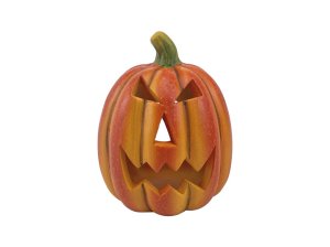Veselá keramická dýně s kloboukem – svícen s halloweenským nádechem.