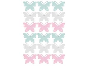Sada 18 dřevěných motýlků s lepíkem v růžové, bílé, zelené a šedé barvě je ideální pro rychlé a stylové zdobení.