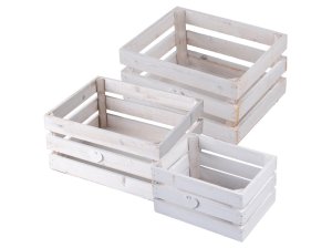 Sada tří bílých dřevěných bedýnek – praktické i dekorativní řešení pro uskladnění a aranžmá.