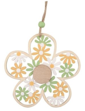 Dřevěný závěs včelí plástev ve tvaru kytky v přírodní a barevné barvě 95X120mm