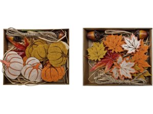 Mix podzimních dekorací – 12 listů nebo dýní + 2 žaludy v teplých barvách.