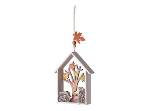 Závěsná dřevěná dekorace – strom s ježky v domečku 140×175 mm, přírodní s mixem barev.