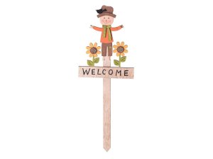 Dřevěná dekorace – strašák s přírodními a barevnými prvky, ideální pro podzimní aranžmá a útulnou atmosféru.