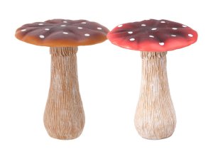 Dekorativní polyresinová muchomůrka ve velikosti 115 × 141 mm v pestrém barevném provedení, ideální jako hravý doplněk do interiéru i na chráněná venkovní místa.