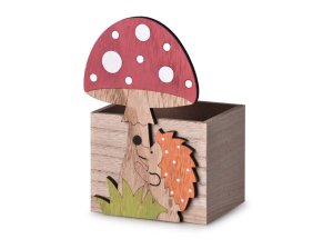 Dekorace ježka držícího muchomůrku.