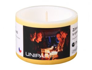 Svíčka ve tvaru válce je zdobena motivem levandule.