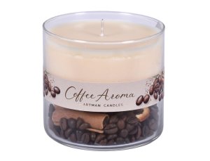 Dekorativní vonná svíčka ve skle s vůní čerstvě mleté kávy vytváří příjemnou a hřejivou atmosféru.
