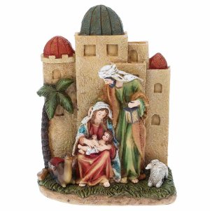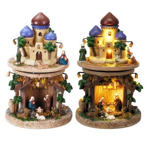 Betlém s LED světlem, hudbou a otočnou scénouInteraktivní betlém z polyresinu přináší kouzelnou atmosféru Vánoc díky LED osvětlení, hudbě a otočné kulisové scéně.
