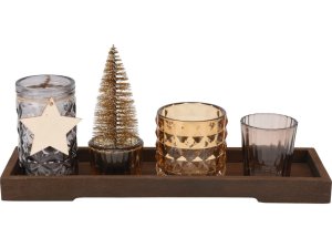 Dřevěný svícen s difuzérem a skleněnými kalíšky na svíčky.