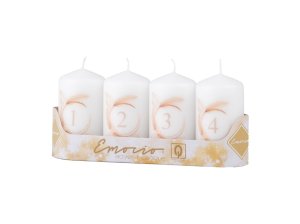Set adventních svíček z nichž každá má jiný povrch (matný, lakovaný, metalický a brokátový).